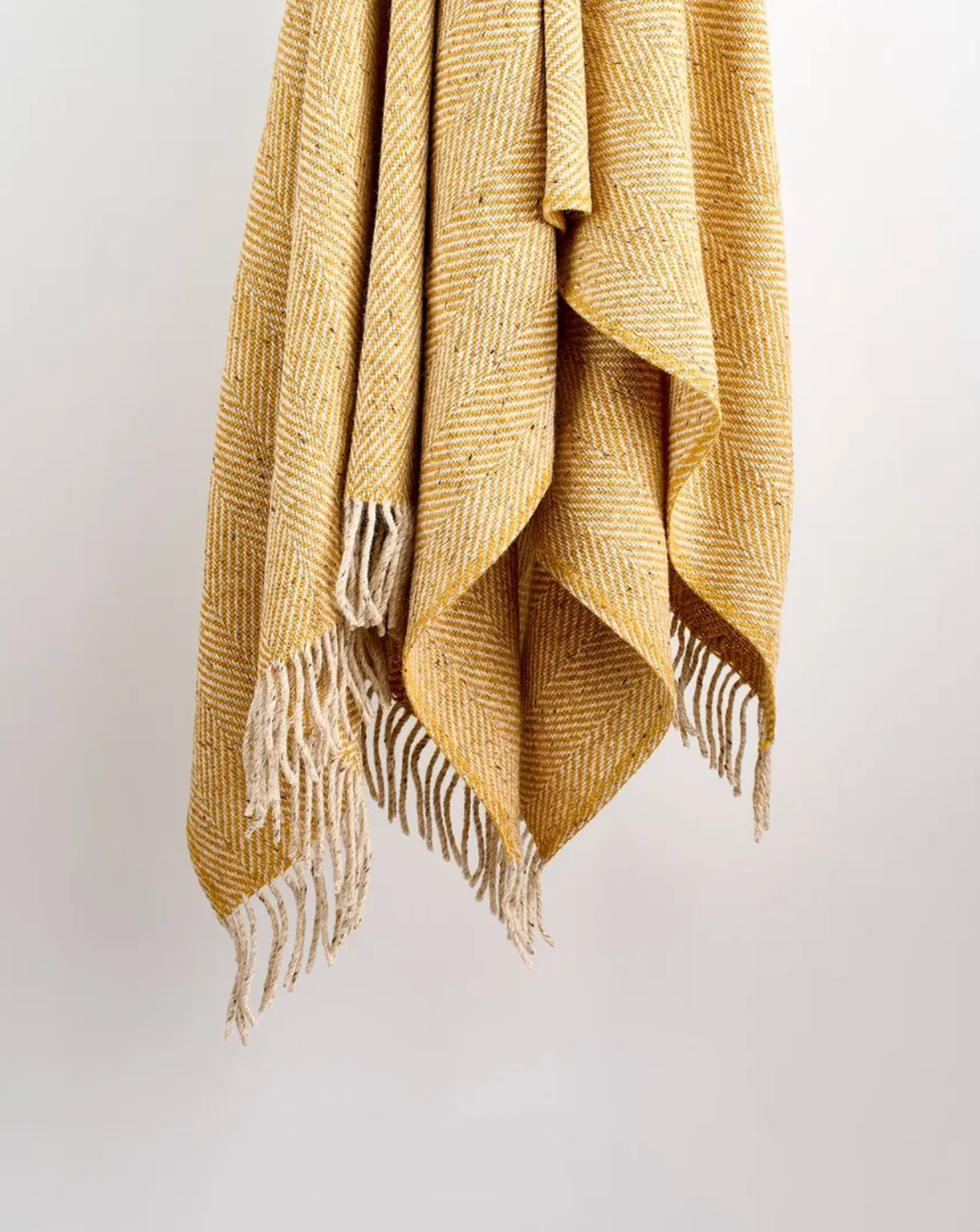 Inspired by the golden gorse of the Wicklow Hills, this throw adds a warm, inviting touch when draped over your cosy armchair. Woven from Donegal yarn in a subtle herringbone weave and finished with a thick fringe, it brings warmth and charm to any space. A piece you'll reach for time and time again.