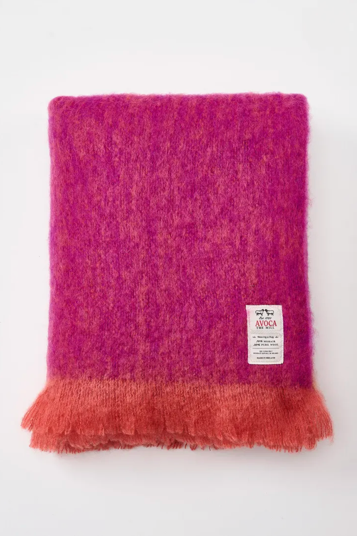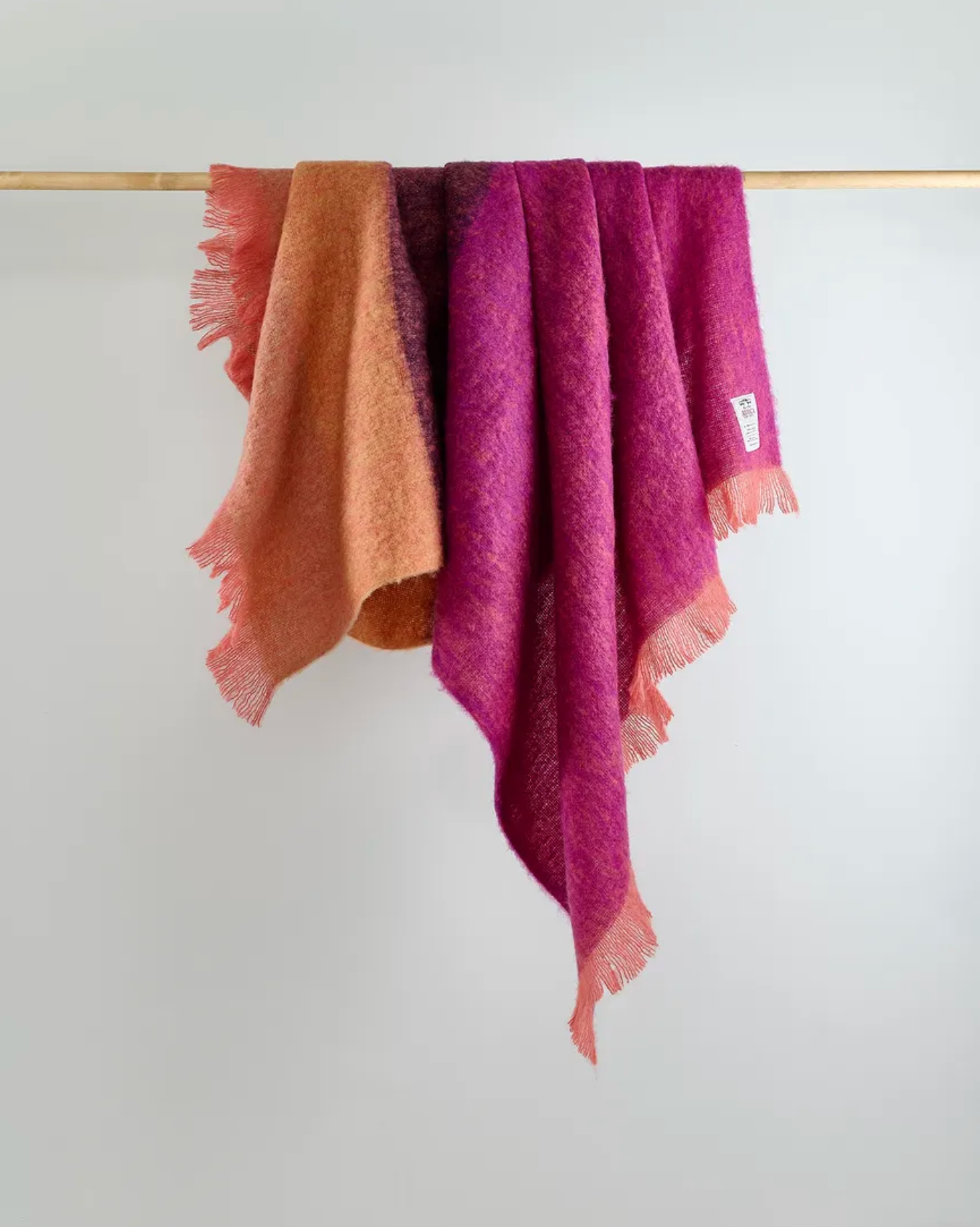 Adorn your home with the luxurious texture of this sumptuous throw. Crafted from a mix of mohair and new wool, this contemporary blanket features sumptuous block stripes in a sunset burst of fuchsia pink, rich violet, and soft orange making it perfect to update your sofa or as a bedroom blanket.
