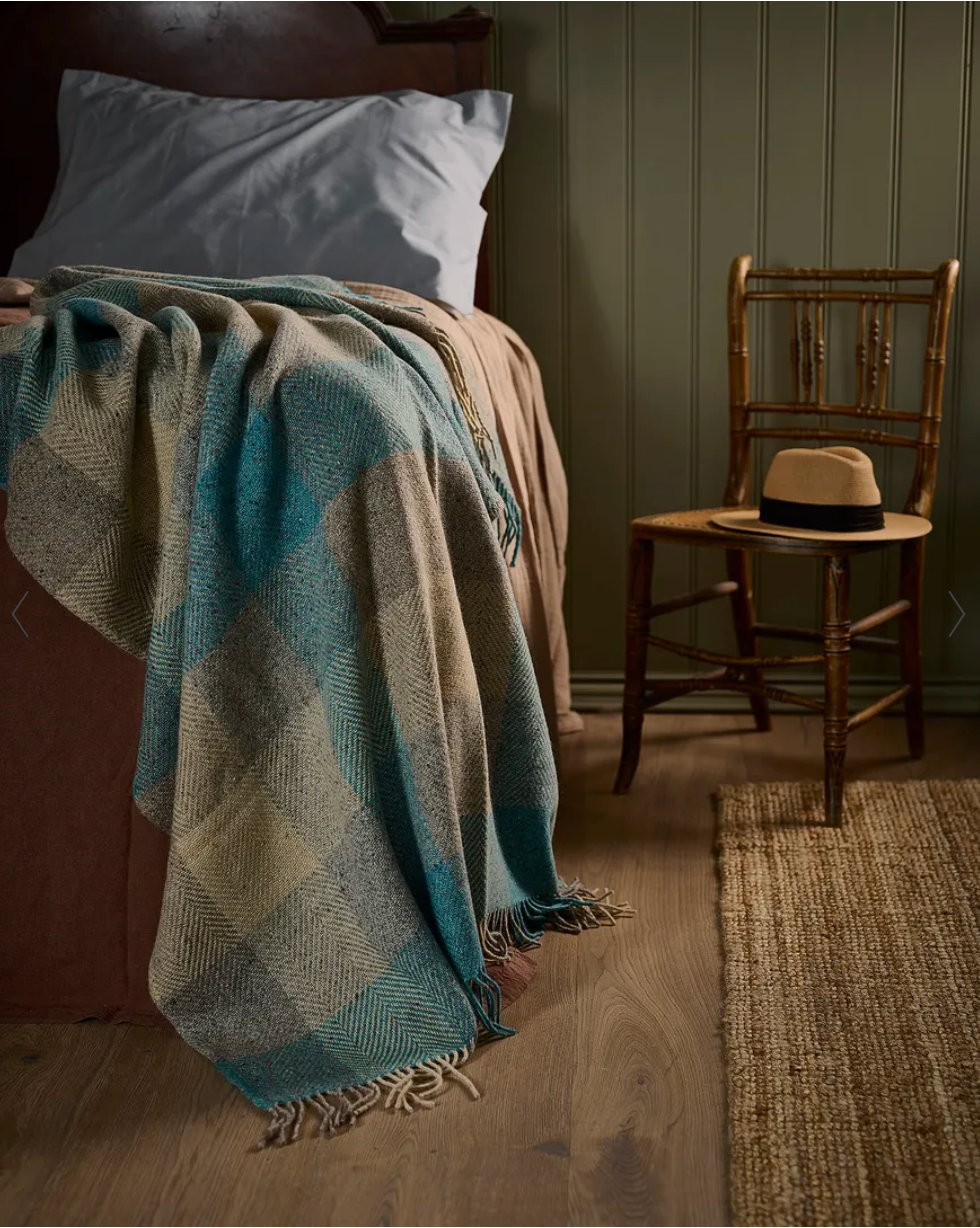 Crafted in a soft to the touch blend of Donegal wool and mohair yarns, this stunning tweed throw is a beautiful balance of luxury and heritage. Woven by our expert team The Wicklow Mill. An uplifting palette of soft creamy beige and brilliant turquoise blue, it's reminiscent of a soft dewy morning. The perfect throw to introduce a fresh update to your bedroom or living space.
