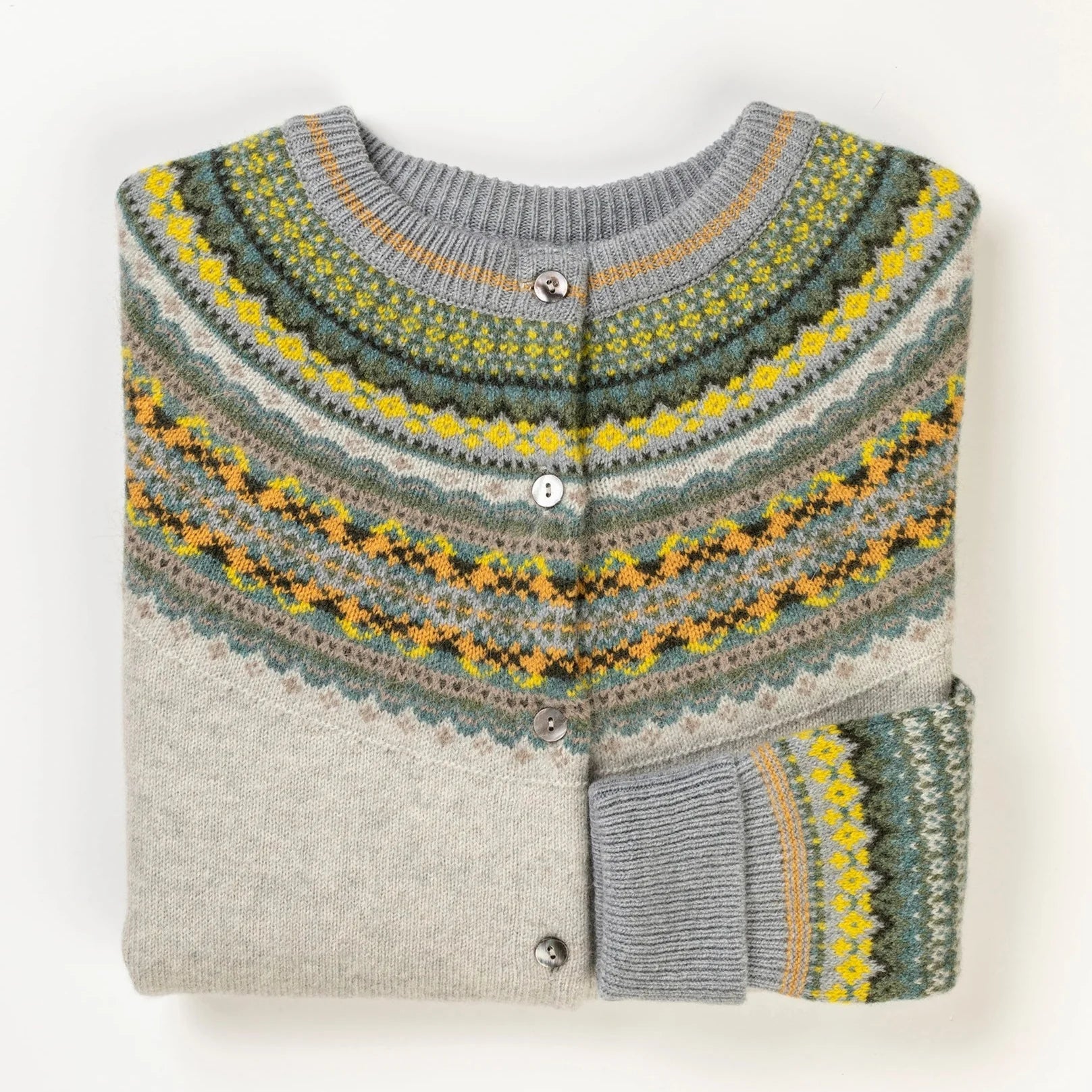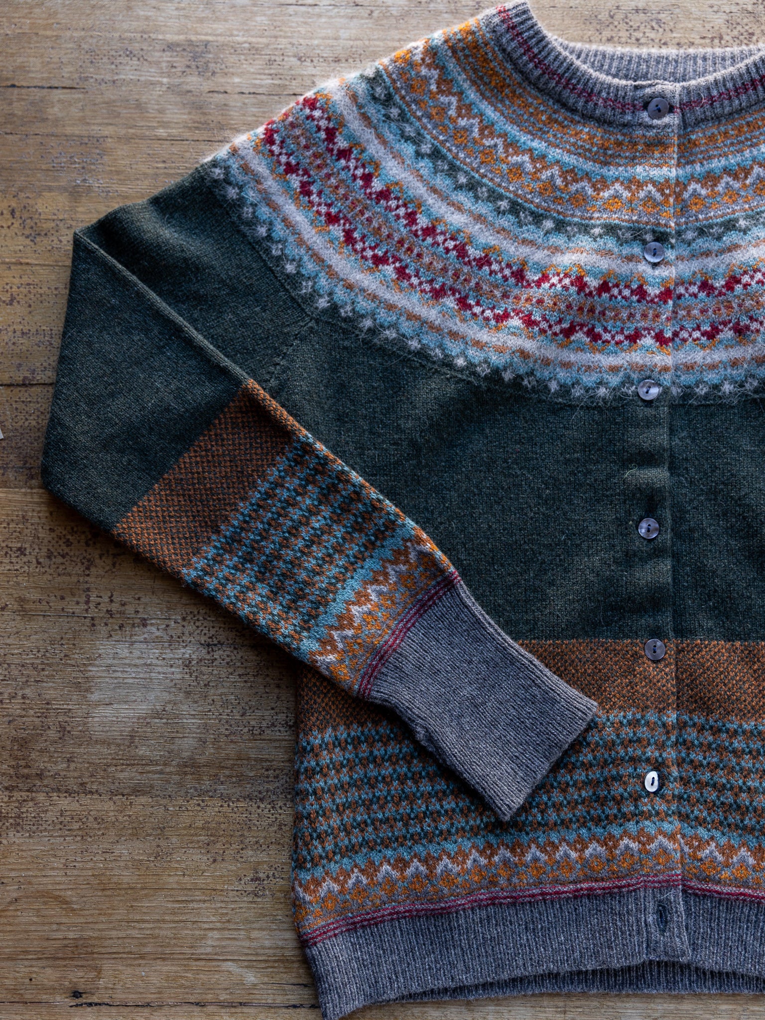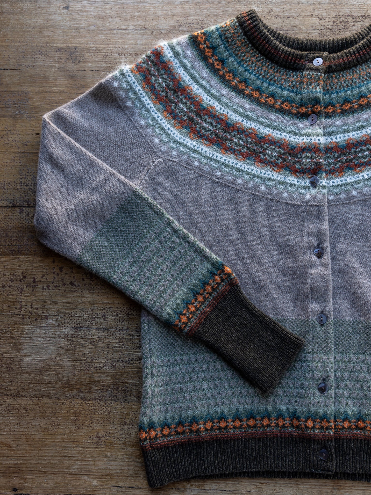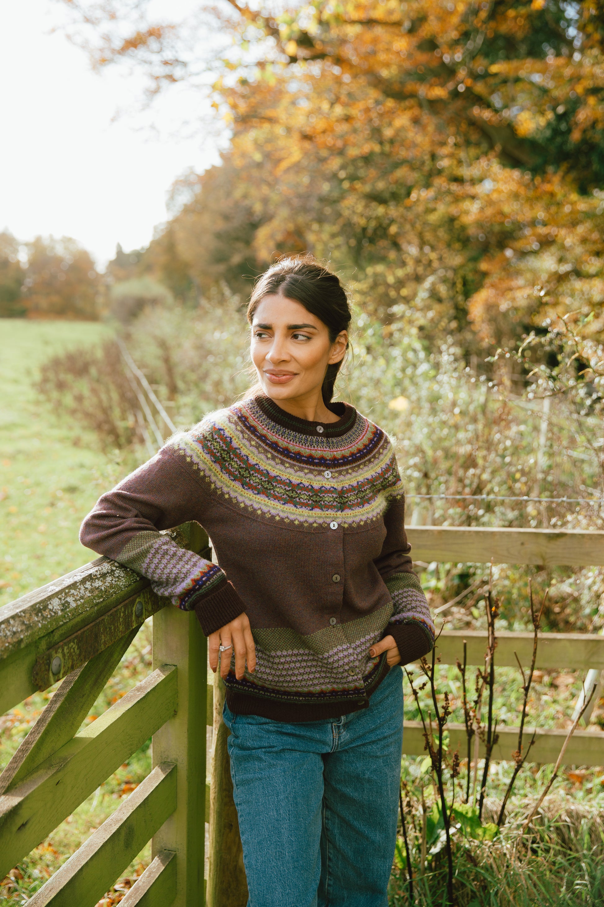 The ERIBE signature style, the iconic Fairisle pattern yoke Merino Wool cardigan has a slightly shaped waist for a flattering fit and a touch of luxury angora in the yoke for added soft texture. Finished with mother of pearl buttons and cosy long turn-down cuffs to keep your hands warm, it is perfect for layering with dresses and jeans for a stylish, casual look.