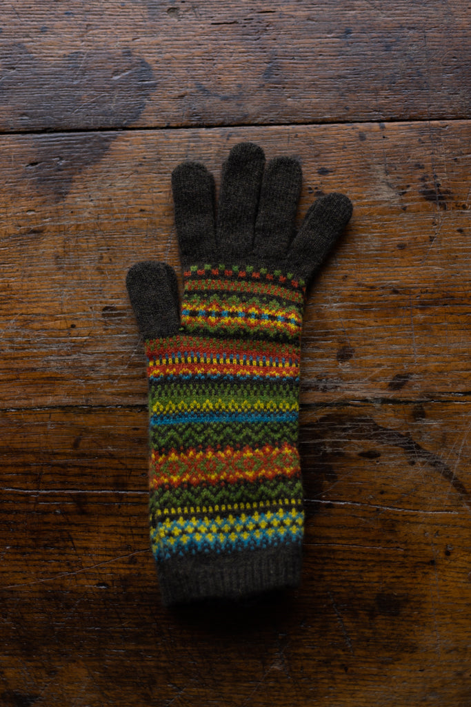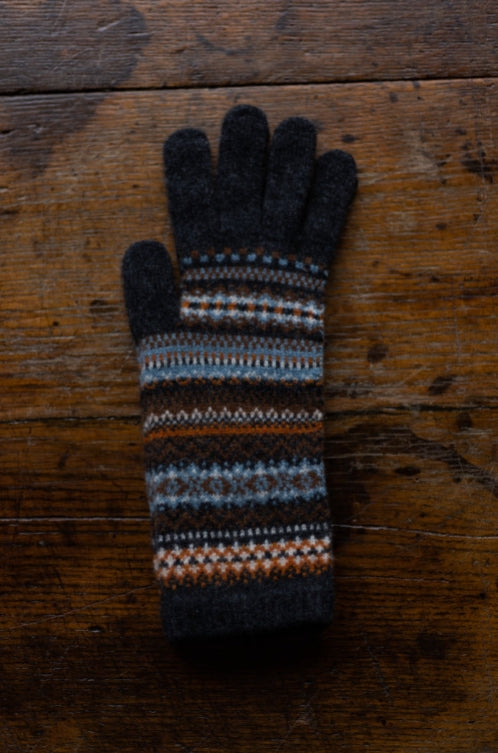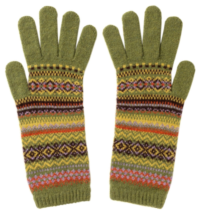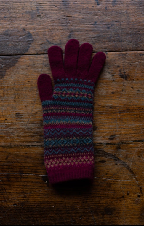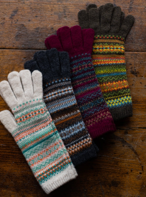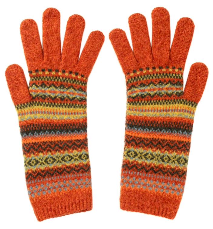 Cosy Alpine gloves are extra long to keep hands and wrists warm. The intricate Fairisle design is finished with a dainty scalloped edge and clever touch screen finger tips! Knitted in Scotland in 100% Merino wool