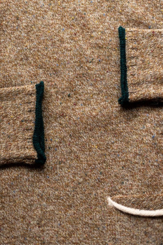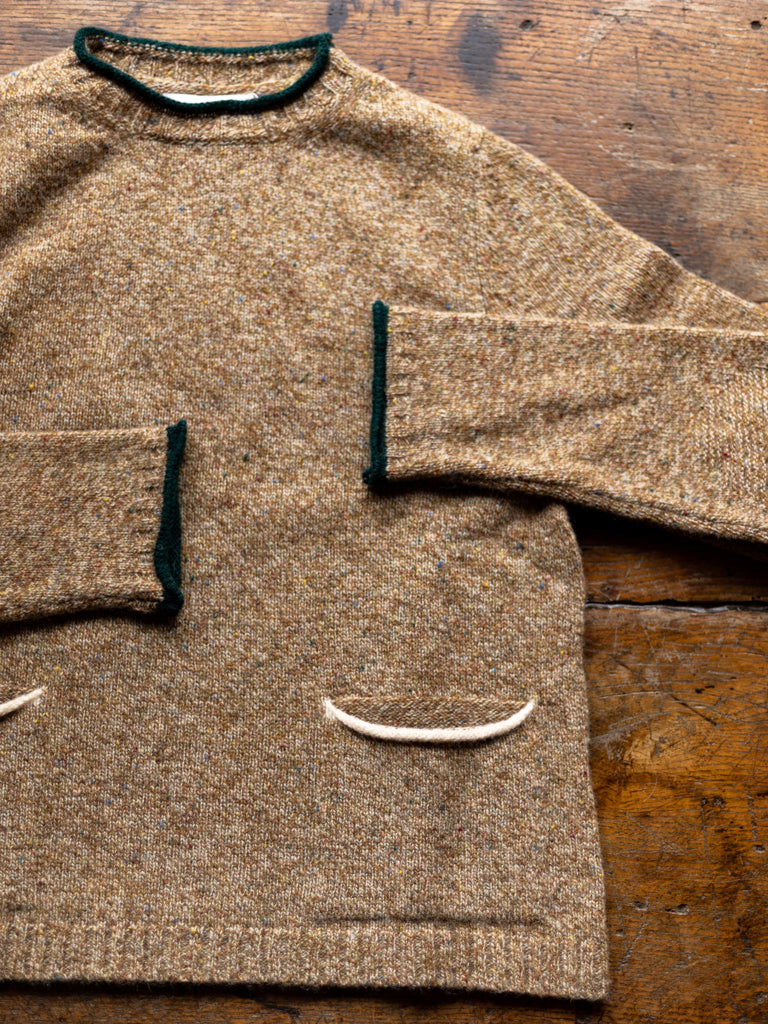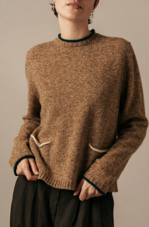 Boxy style sweater with sweet colour details on cuff and neck. Lightweight wool with colour fleck throughout. The style features two pockets on front and Purl stitch detail on elbows.