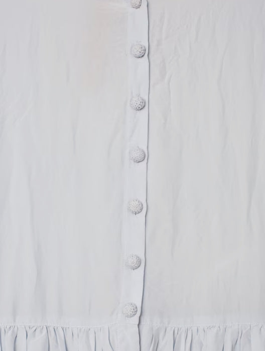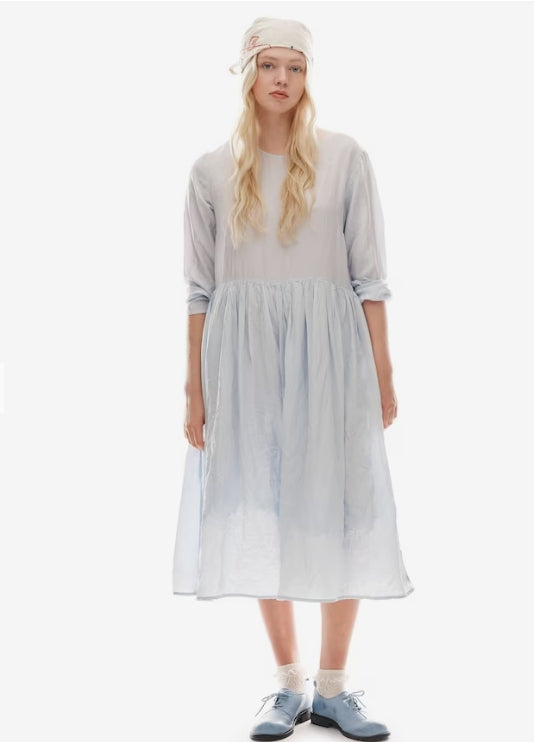 Calf-length dress in silk with long sleeves. Wrinkled from the waist for lovely volume and buttoning at the back with crocheted buttons. Model is 175cm tall wearing size M.