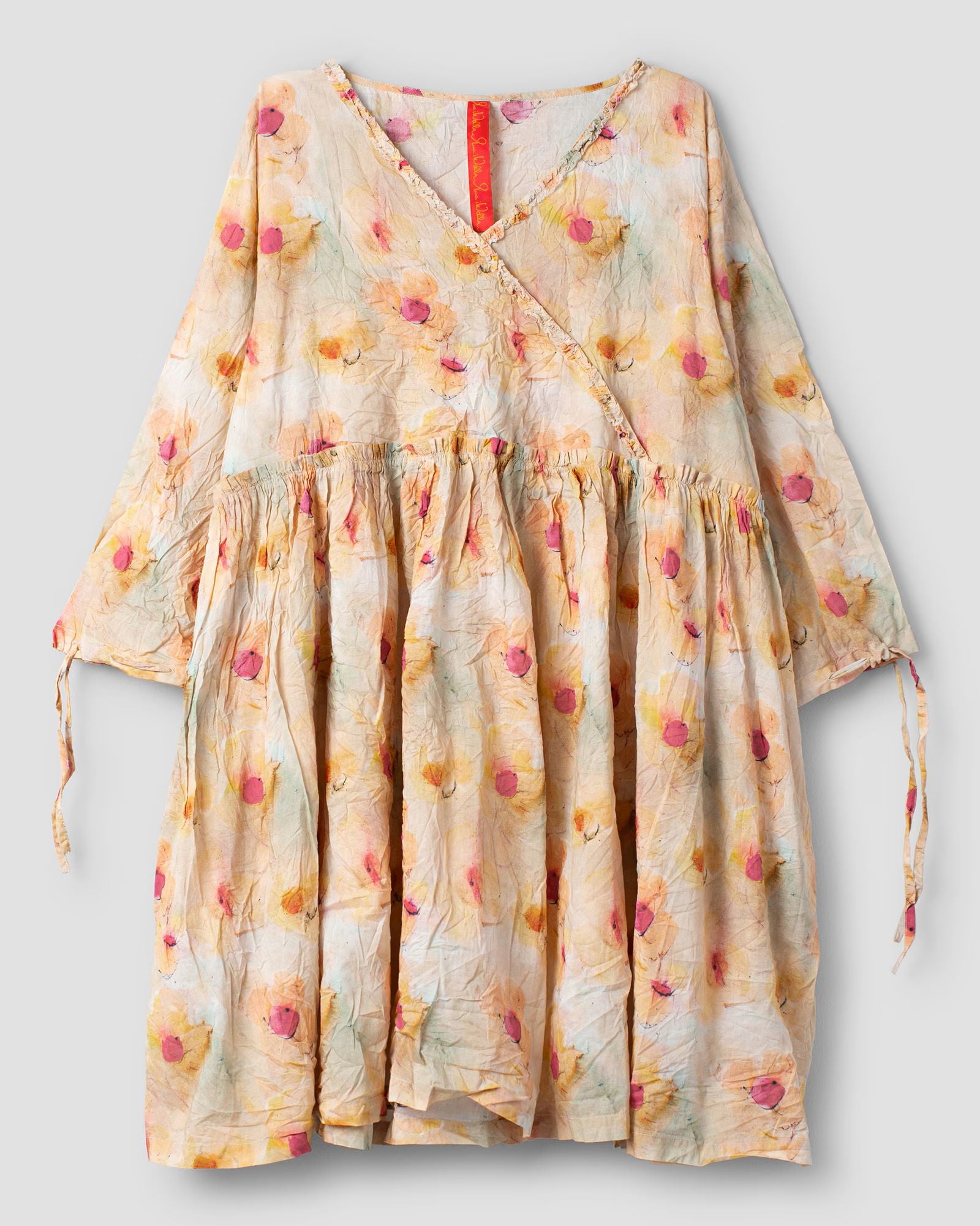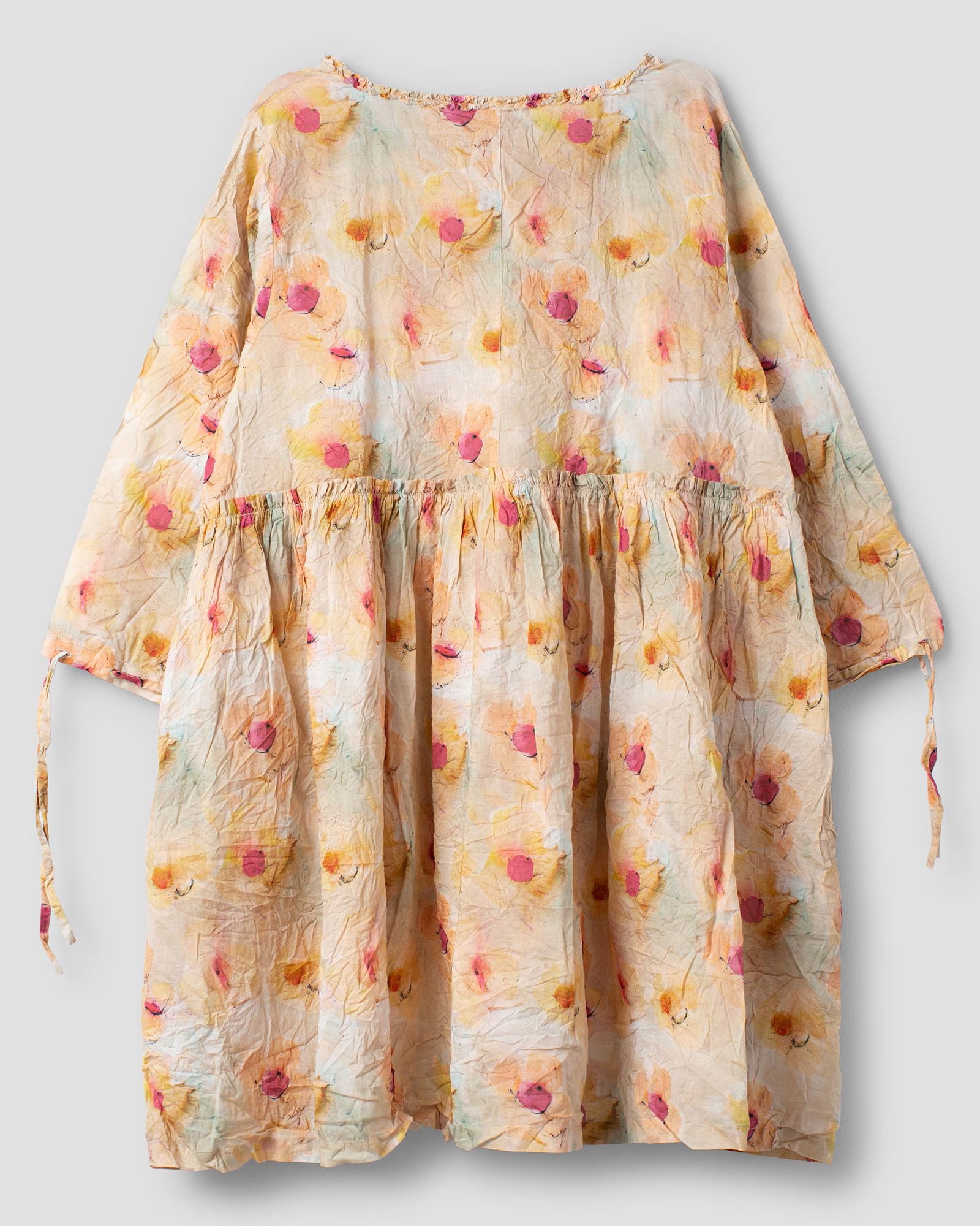V-necked tunic in flower voile, wide sleeves with tie ribbon. Decorative ruffle around the neckline, wrinkled from the waist and side seam pockets.