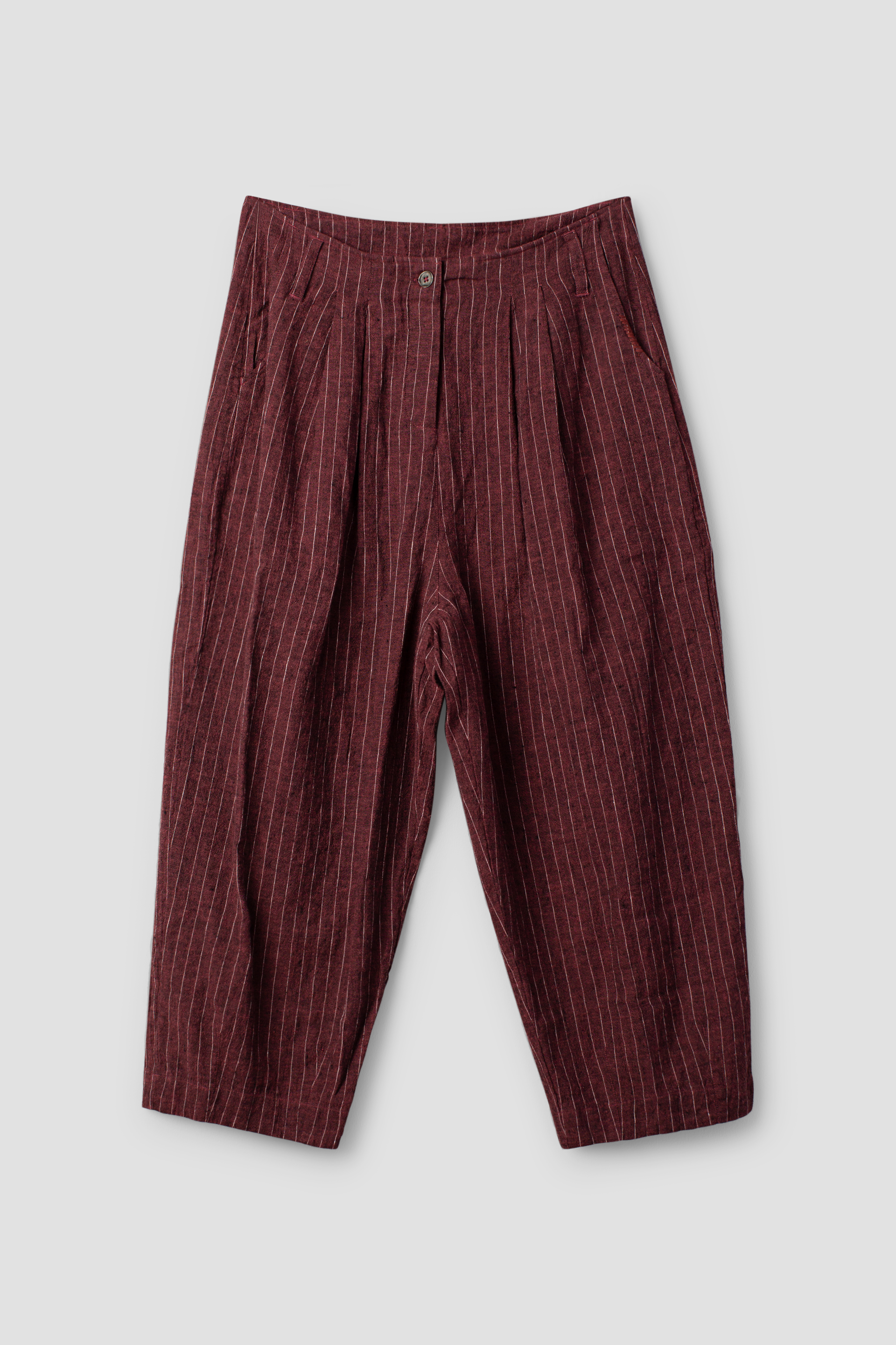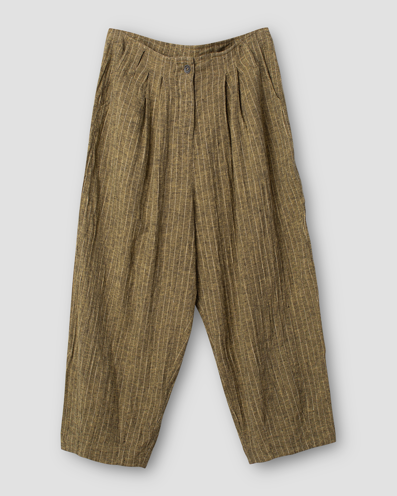 Pinstripe Pants in linen with zipper and belt loops. Side pockets and a welt pocket at the back. Beautiful details with patches, sashiko stitches and small-floral cotton in the waistband and hem.