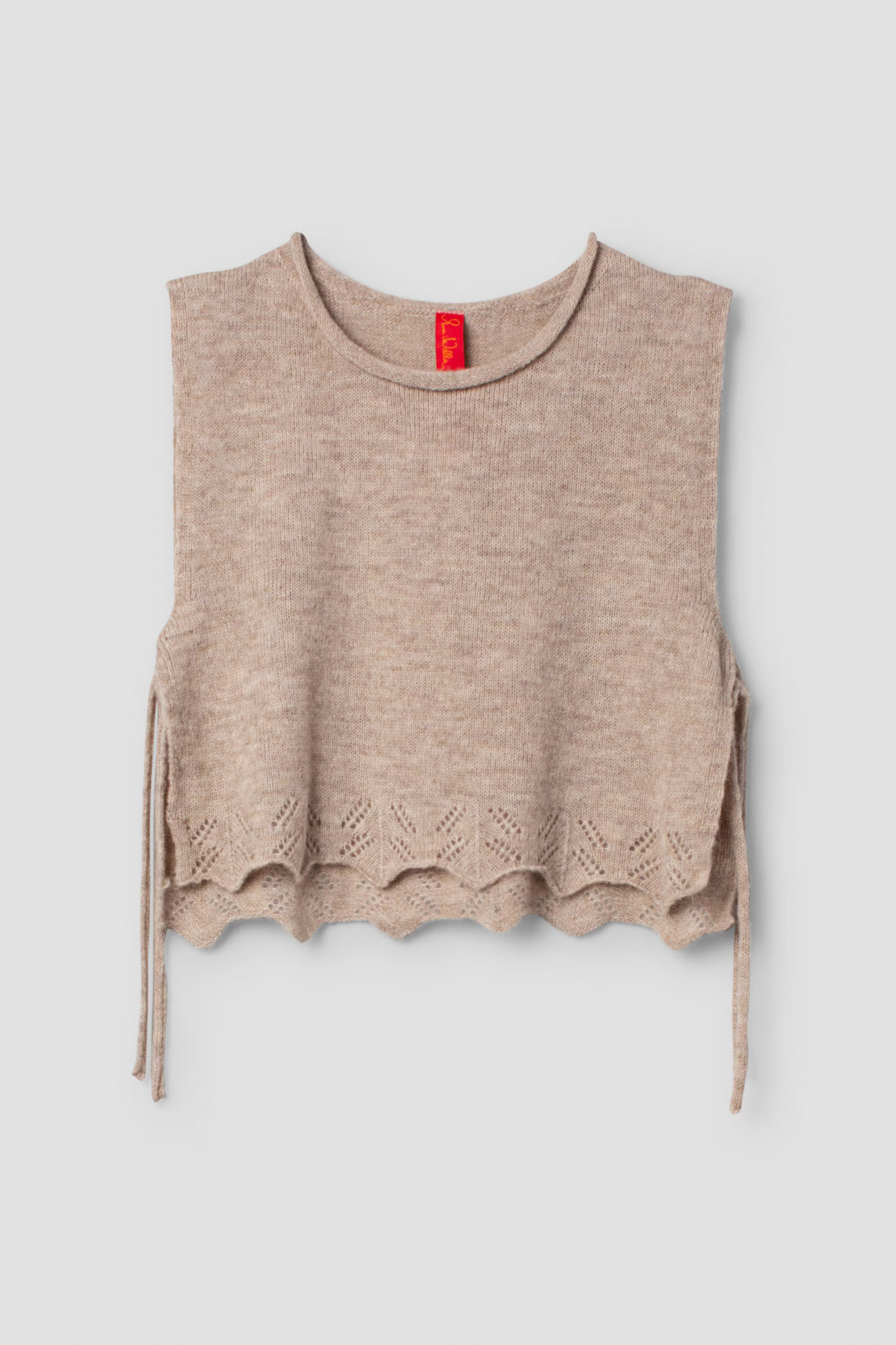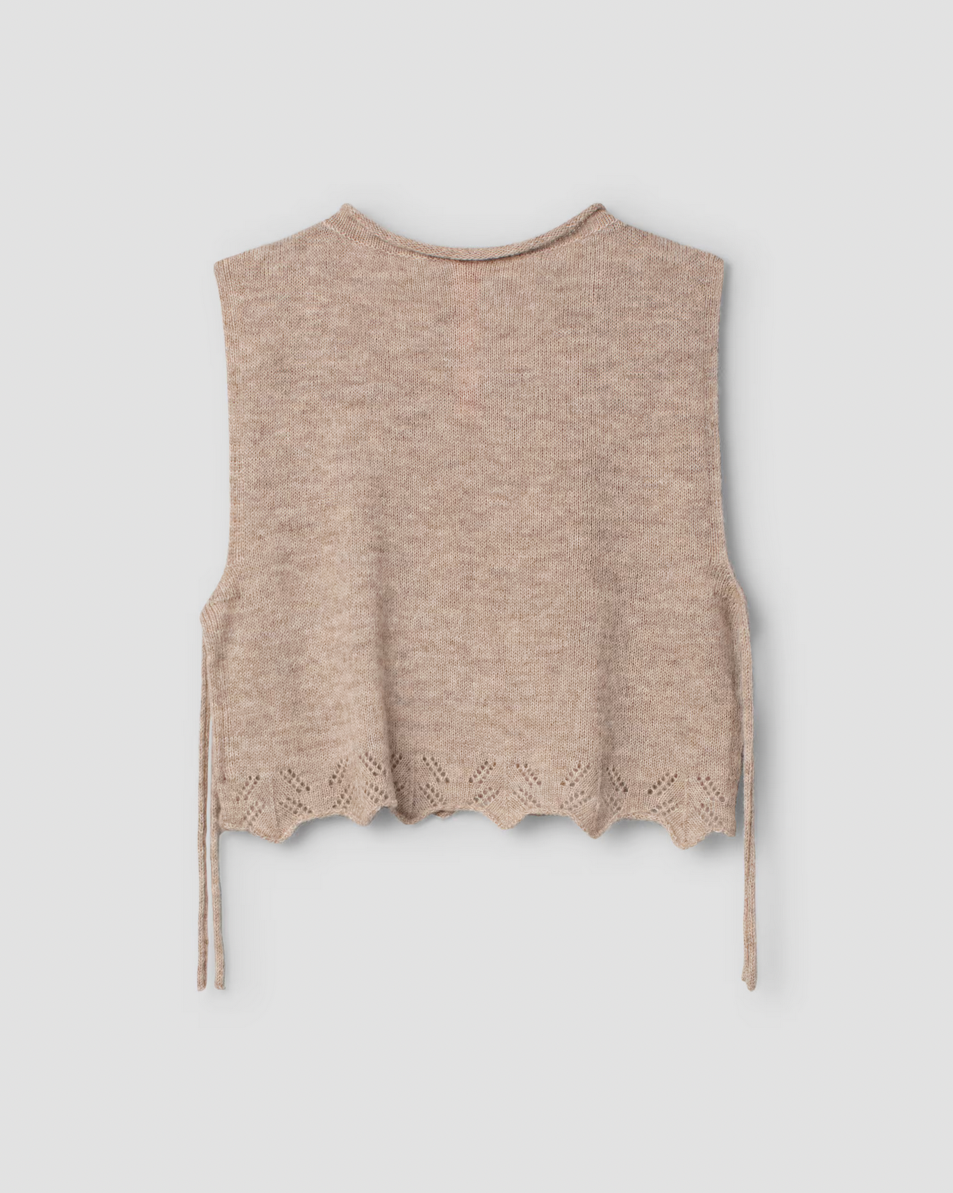 Knitted vest in soft baby alpaca with tie ribbons at the side and beautiful lace knitting at the bottom.