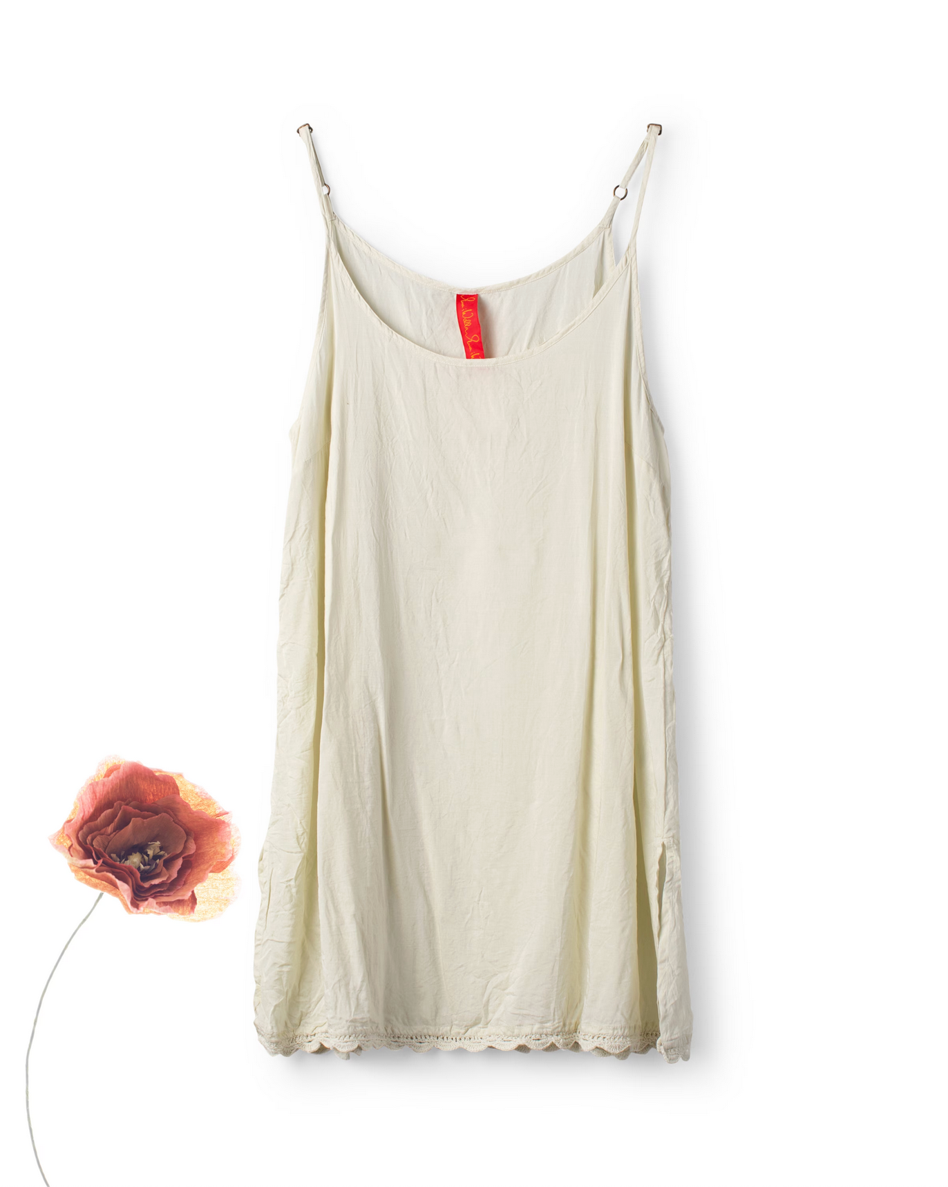 Longer viscose top with adjustable shoulder straps and beautiful crocheted cotton lace at the bottom and with vents in the sides. The perfect top to wear under all our models in sheer organdie.