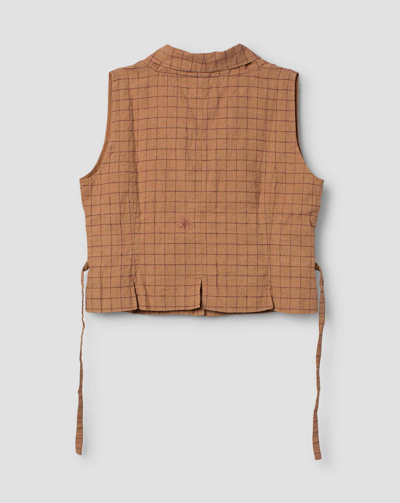 Checked linen vest with shawl collar, jetted pockets and hook and eye buttoning. Tie ribbons in side seam, beautiful handmade embroidery and vents at the back.