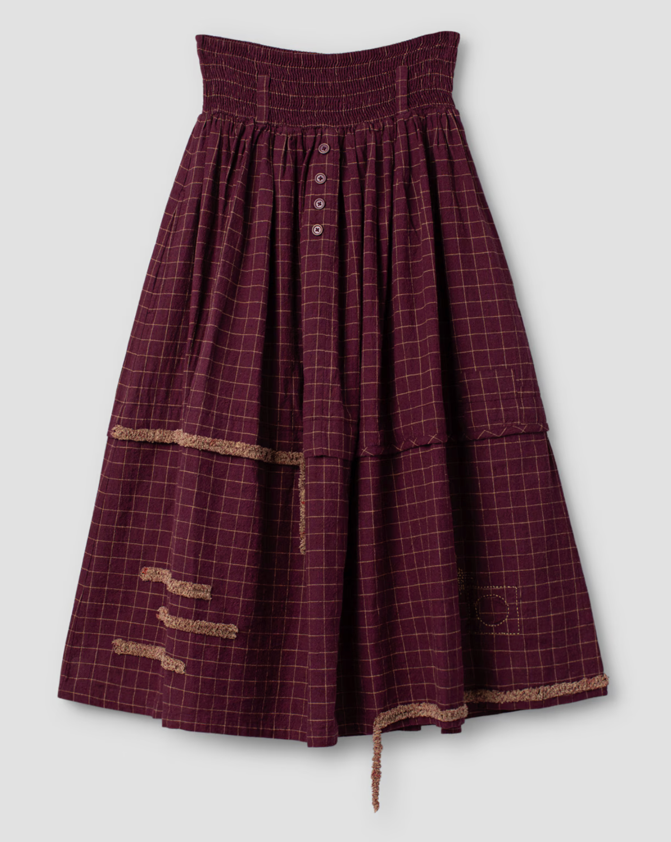 Ankle-length checked linen skirt with smock at the waist for a good fit and belt loops. Wrinkled from the smock for lovely volume, side seam pockets, decorative details with button fly, handmade embroideries and ruffles.