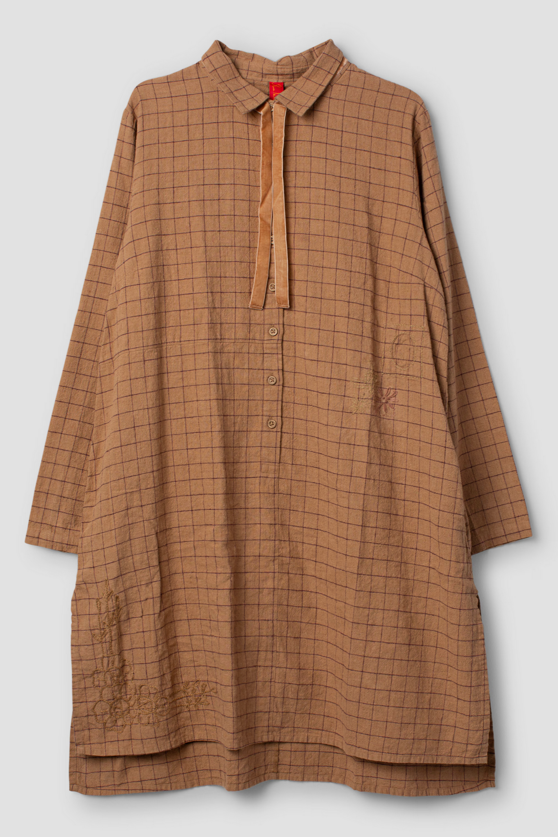 Long-sleeved shirt in checked linen with collar and tie ribbons in velvet. Buttoning and beautiful handmade embroideries at the front, vents and pockets in side seam.