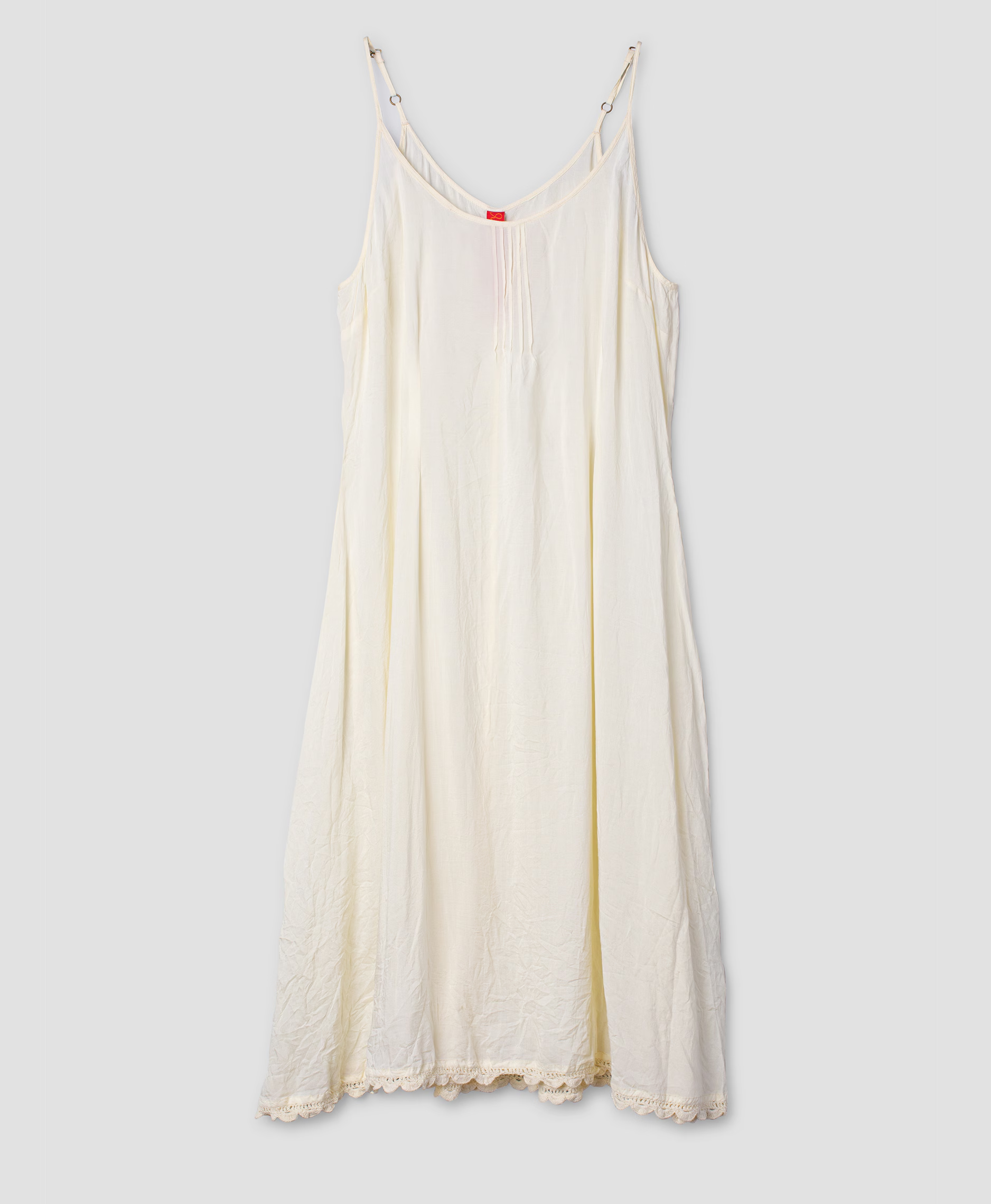 Knee-length dress in viscose with adjustable shoulder straps. Decorative pin tucks at the front and beautiful crocheted lace at the bottom. The perfect dress to wear under all our models in sheer organdie.