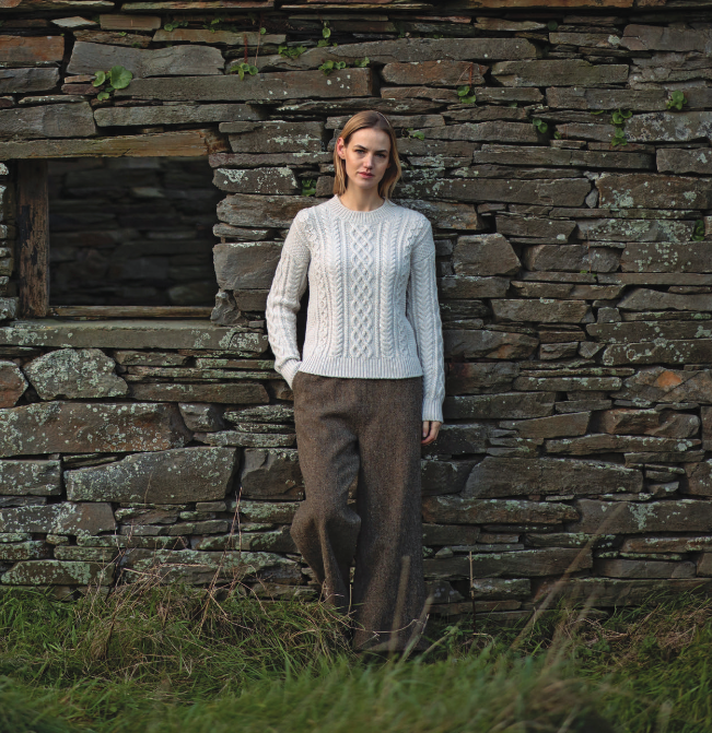 The Ladies Fisherman crew neck sweater truly meets the charm of Ireland's traditional knitwear heritage. A stunning array of cable, moss and diamond Aran stitches, coupled with rib-knit cuffs, hem and neckline, ensure that this classic sweater is both cozy and stylish.