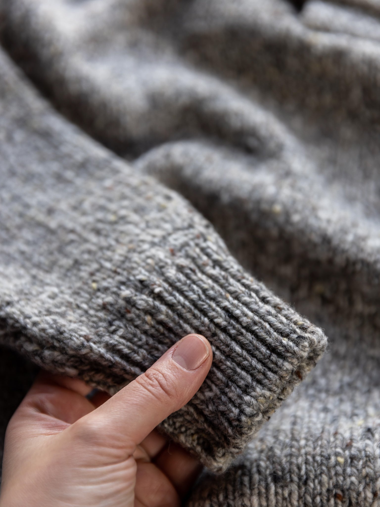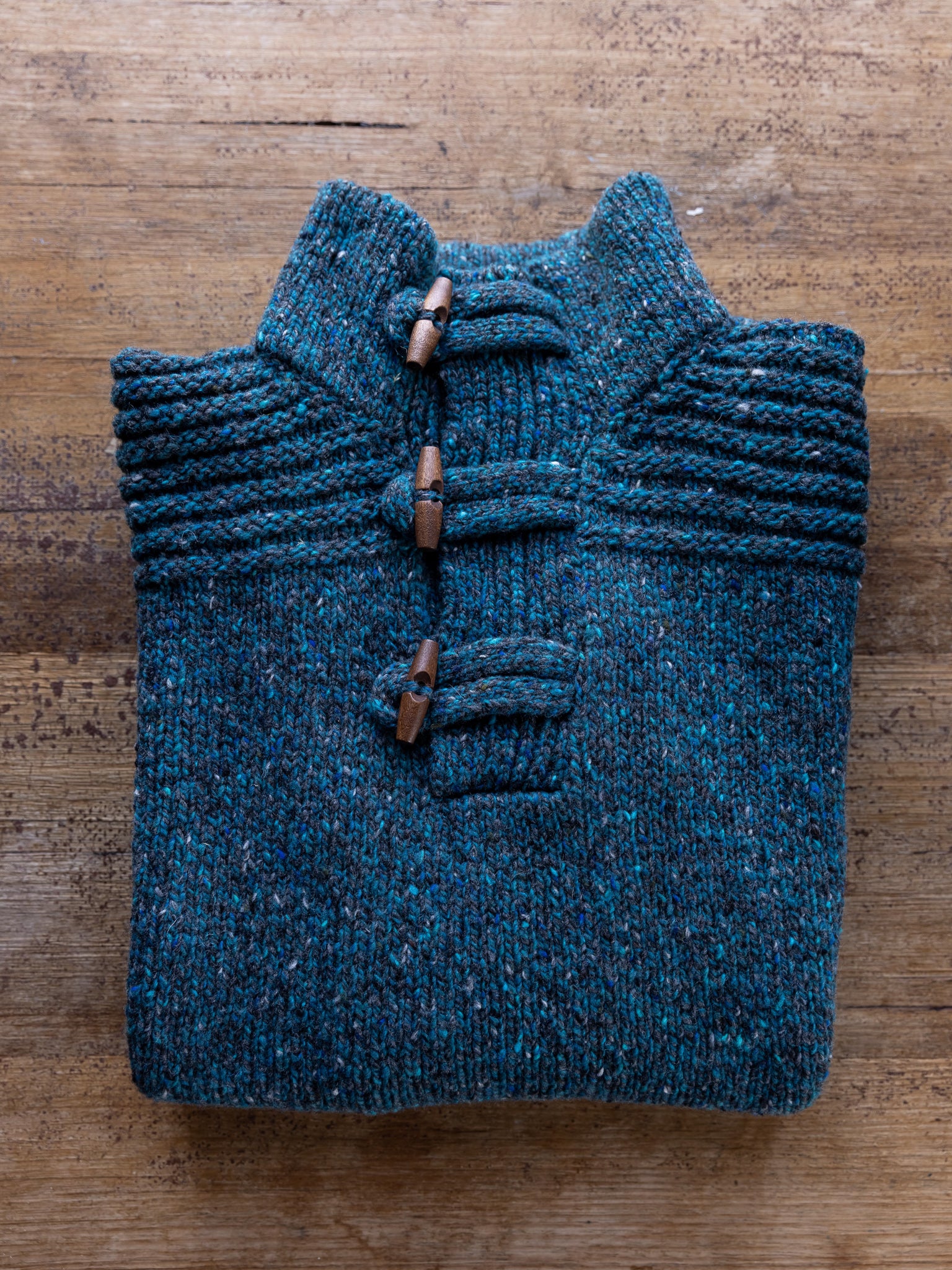 A traditional Fisherman Sweater made in County Donegal. Knitted from traditional yarn sourced and produced wth Mulesling Free Merino Wool with a warm and durable finish. Featuring a toggle button fastening and high turtleneck. Sustainably made and completely timeless, this sweater by Fisherman Out of Ireland will transcend the seasons. The flecked yarn reflects the natural colors of Ireland’s rugged landscape.