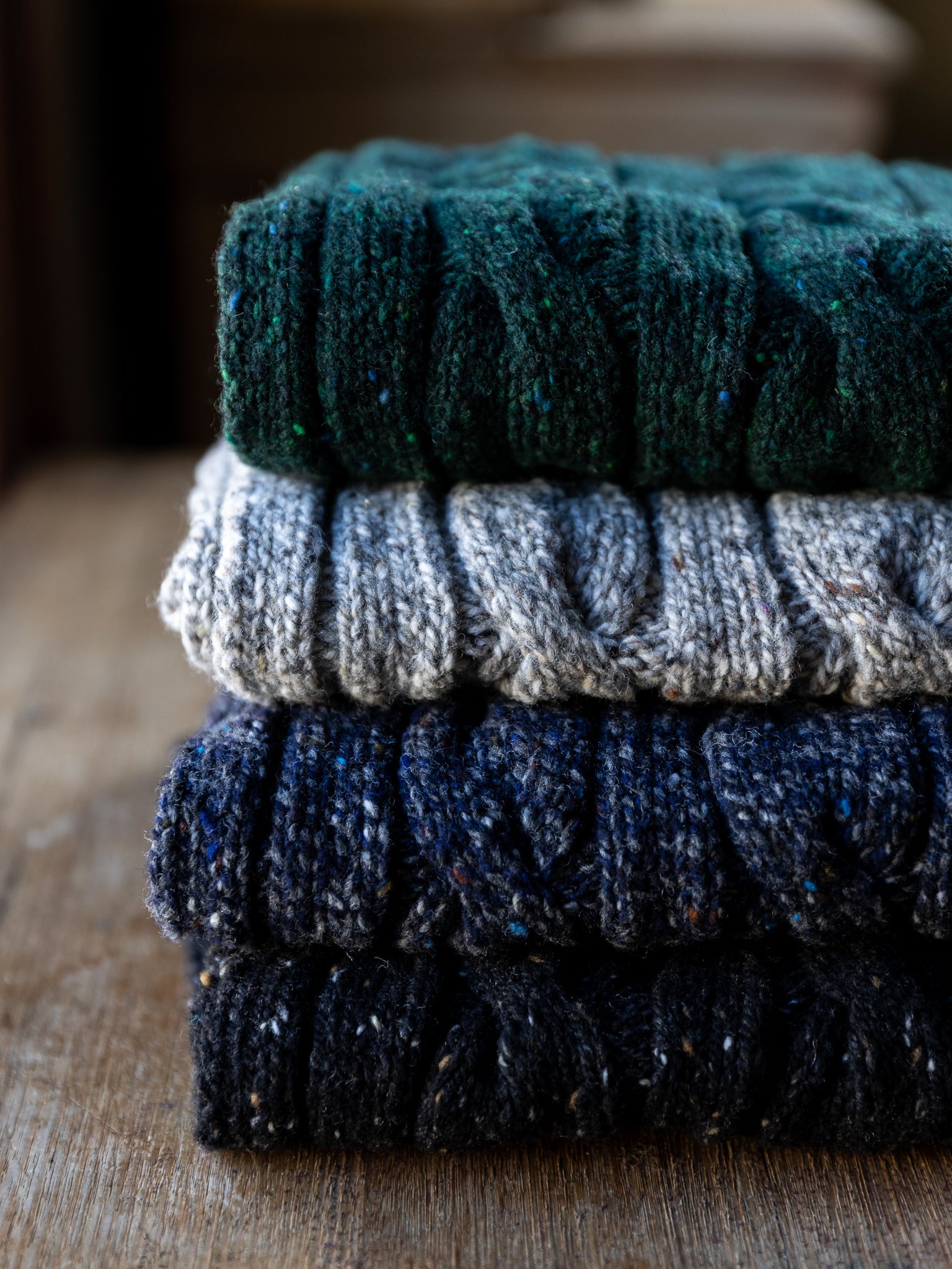 100% merino wool in County Donegal, this classic scarf has a cable and rib knit design. It is thick and luxurious, ideal to keep you warm and cozy for the colder days to come.