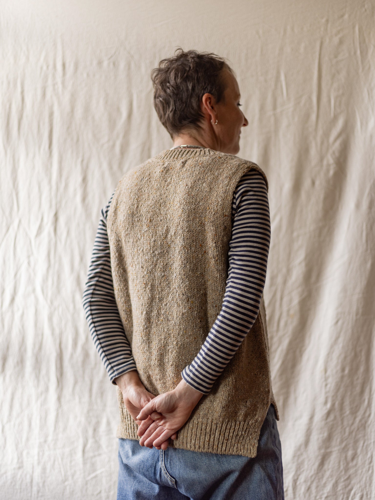 Crafted in Ireland using Fisherman’s signature mulesing-free Donegal fleck merino wool, this v-neck sweater vest is an authentic and sustainable piece of Irish knitwear. It is thoughtfully finished with a contemporary dipped hem and two side slits.