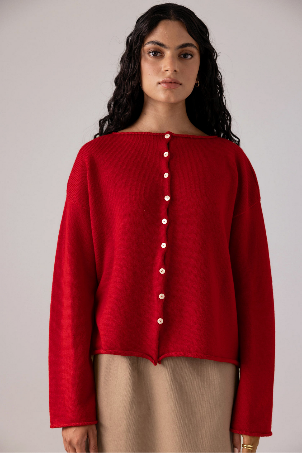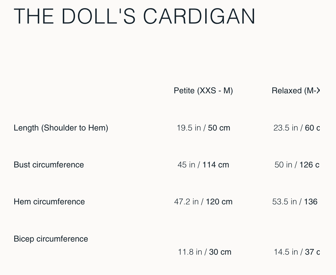 The doll's cardigan features a drop shoulder, a boxy yet cropped fit, and a boat neck.