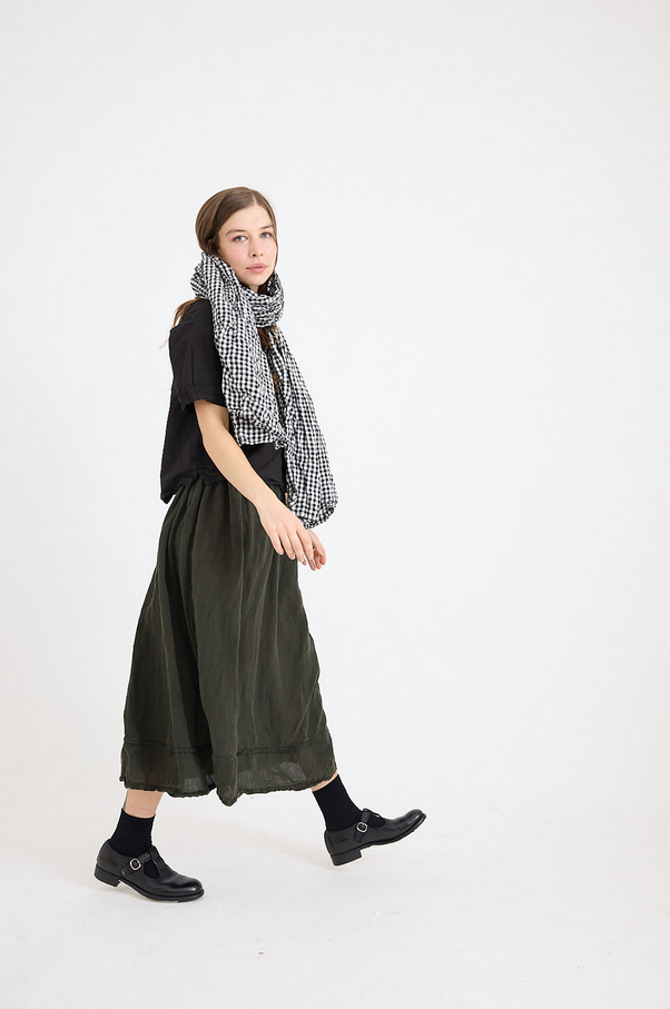 A long floaty skirt with a hem pleat, flat waistband at the front, elastic waist at the back and pockets. This skirt is made from a lightweight linen so it's light and floaty to wear.