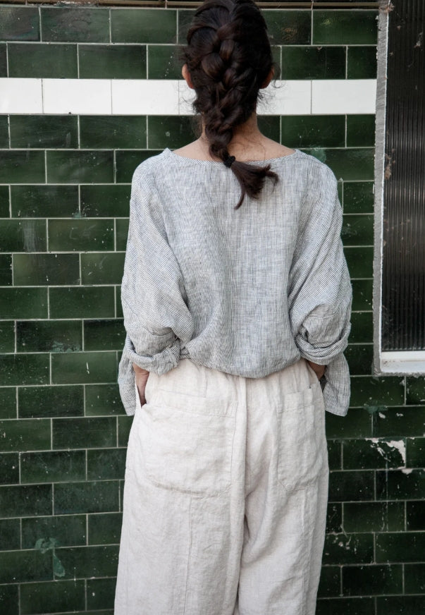 The Frankie Peg Pant is a mid-weight linen pant with a beautiful drape. The Frankie Peg Pant is made from a luxurious 100% European linen and designed in Melbourne. It features a relaxed fit around the hips, creating a flattering cocoon shape.