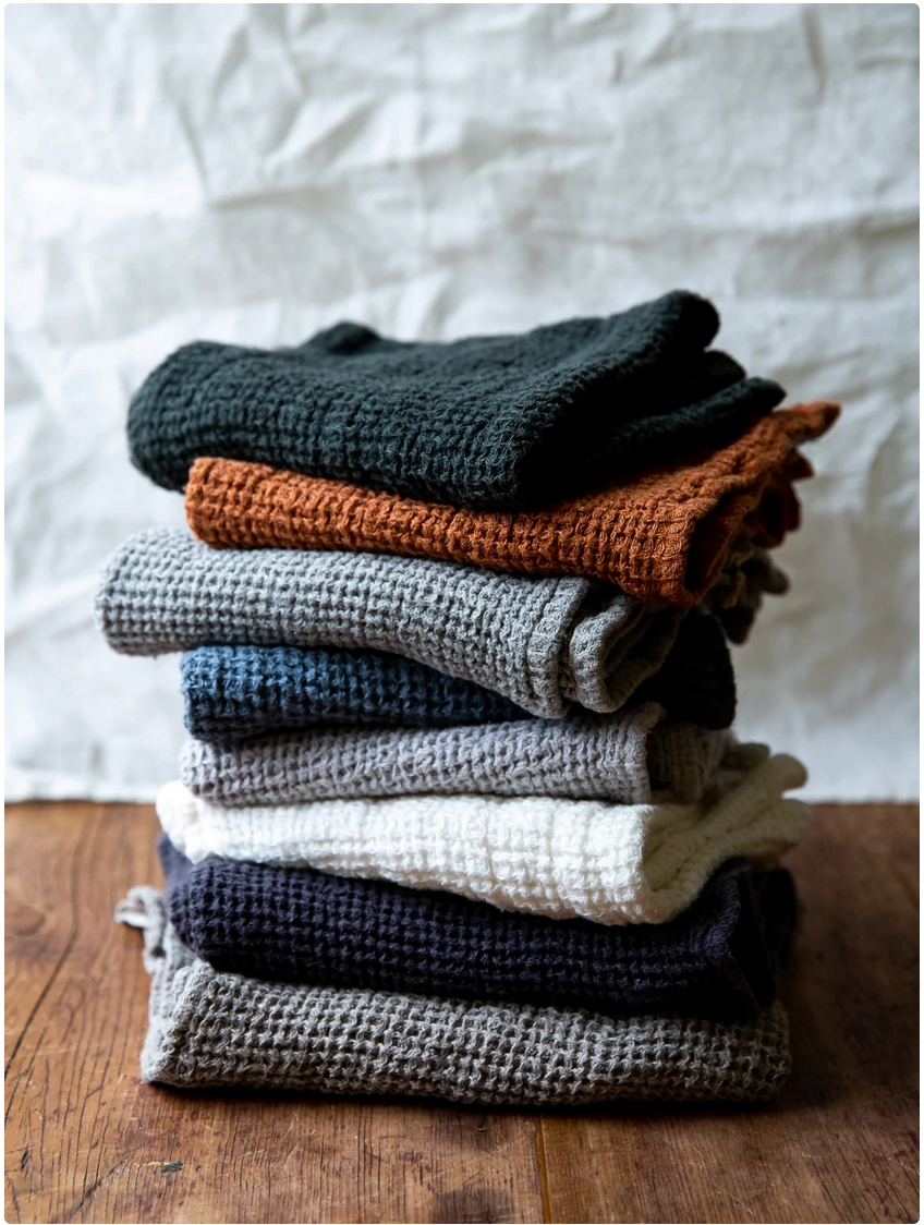 these textiles absorb more water and dry forty percent faster than other types of textile due to the inherent qualities of pure linen and the waffle weave. this makes them an eco-friendly and healthier option by not remaining damp.